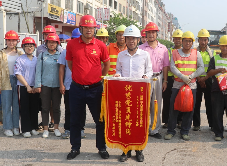 在項(xiàng)目現(xiàn)場(chǎng),蘭乾雄為戰(zhàn)斗在一線的工人們發(fā)放了西瓜、清涼飲料,并與工人代表拉起了家常,一一詢(xún)問(wèn)了工人的家庭、收入及工資發(fā)放等情況。他說(shuō)到,正是因?yàn)橛幸痪€工人們的努力和堅(jiān)守,我們的一些重點(diǎn)工程和項(xiàng)目才能順利向前推進(jìn),他們是最值得尊敬的人。同時(shí),蘭乾雄為姑婆山大道項(xiàng)目頒授了“2018-2019年度優(yōu)秀黨員先鋒崗”旗幟,肯定了他們?yōu)轫?xiàng)目建設(shè)的付出,鼓勵(lì)他們繼續(xù)充分發(fā)揮黨員先鋒崗先鋒模范作用。
