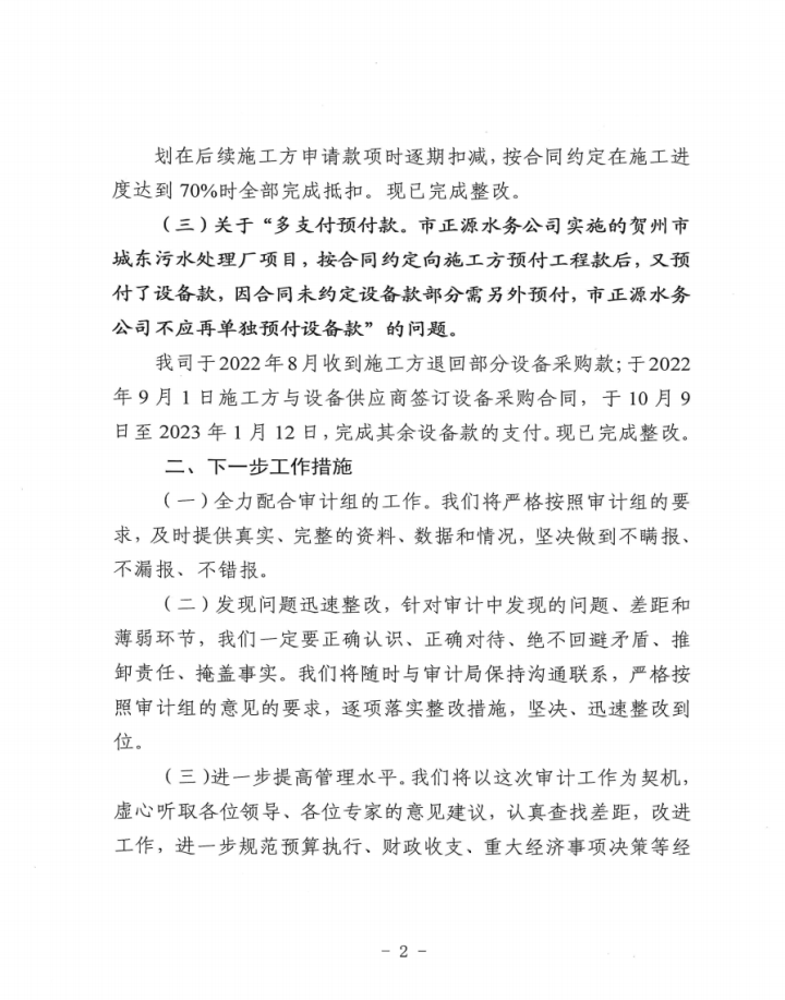 城投水務公司關于賀州市本級2021年度預算執行和決算草案審計項目審計查出問題和整改