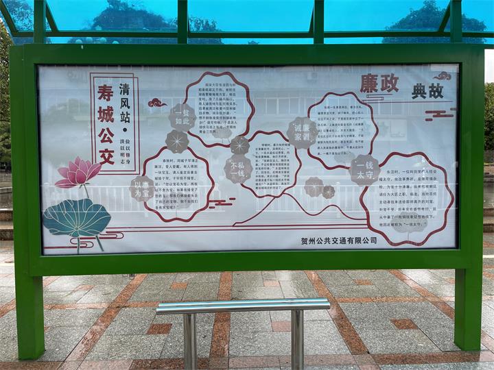 二是建設(shè)“壽城公交清風(fēng)站”。選取靈峰廣場(chǎng)、賀州市教育局公交站臺(tái),將廉政典故、家庭家教家風(fēng)建設(shè)、創(chuàng)建文明城市等內(nèi)容融入公交站臺(tái)宣傳版面,在潛移默化中使廉政文化在市民心中生根發(fā)芽,最大限度地發(fā)揮了文化潤(rùn)廉的良好作用。