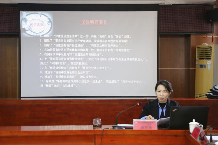 湯彩燕圍繞黨的二十大報告關于國企改革的重要論述和部署進行系統(tǒng)宣講,深入解讀了黨的二十大報告對國企改革提法上的變化以及二十大報告標志了國企改革的八大趨勢等內(nèi)容。她表示,習近平總書記在黨的二十大報告中,對深化國資國企改革作出了新的重大部署,對于國資國企改革的時代背景、方向、使命任務、目標、途徑、要求做出表述,有清晰的時代感與厚重的實在感,為全面建設社會主義國家新征程國有企業(yè)改革指明了方向、提供了根本遵循。