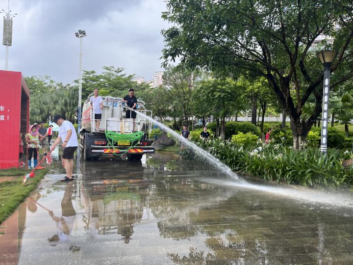 本次清理行動分兩組進行,一是加大路面保潔作業(yè)力度,對散落的樹枝、落葉及洪水攜帶上來的雜物進行清理。二是人機結(jié)合,采取“沖洗+洗掃”聯(lián)合作業(yè)方式,對林蔭小道路面、公園廣場等地進行深度沖洗,徹底消除洪水沉積淤泥。